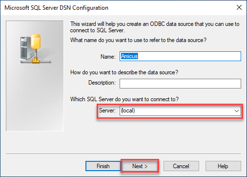 - Start Amicus and Click Next. Click Next until you get to the screen requesting a SQL server name.