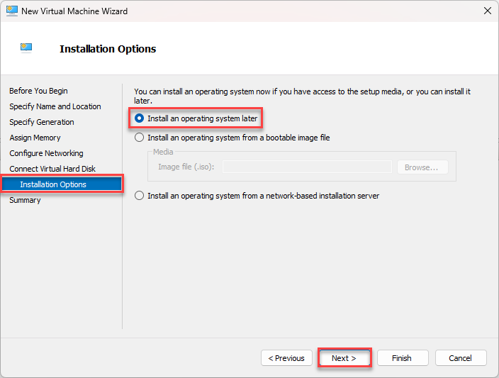 - Installation Options: Select "Install an operating system later". Click Next.