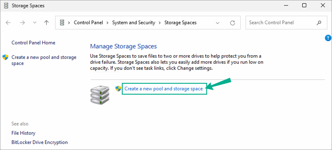 Now we need to create a Storage Space. A Storage Space is a lot like a RAID. We are going to merge two of our SSDs into one big one.