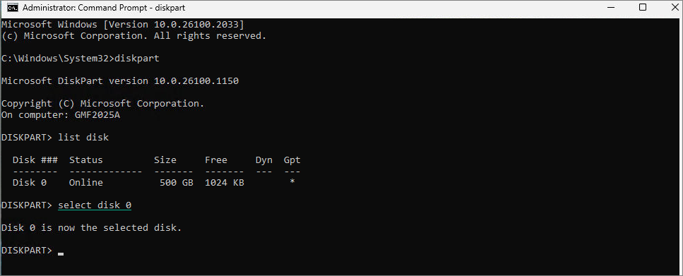 For example, mine is Disk 0, so type: select disk 0 and press Enter