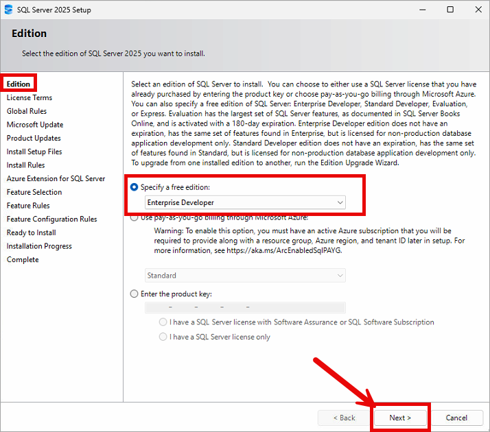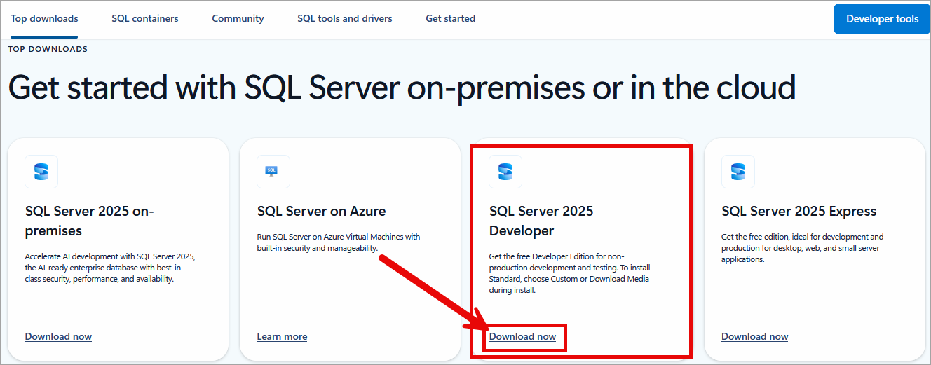 This article will walk you through installing and configuring SQL Server for a migration workstation. Visit https://www.microsoft.com/en-us/sql-server/sql-server-downloads and scroll down to the TOP DOWNLOADS section Select SQL Server 2022 Developer ...