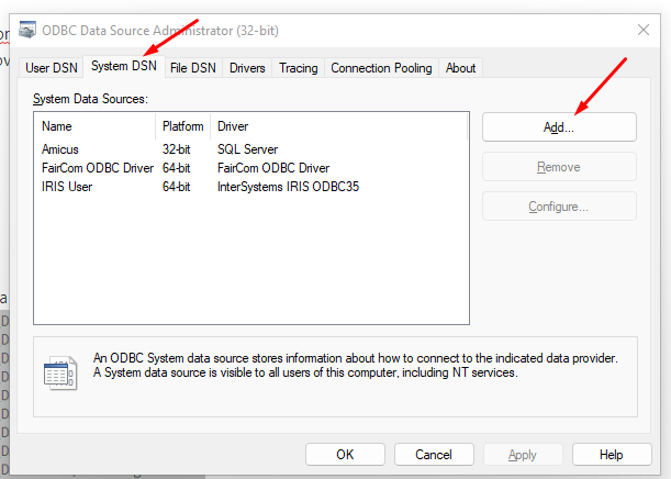 You can also manually open this dialog by searching ODBC 32-bit from your start menu.
