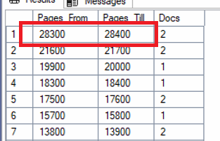 The example above indicates that there are 2 documents that have between 28,300 and 28,400 pages.