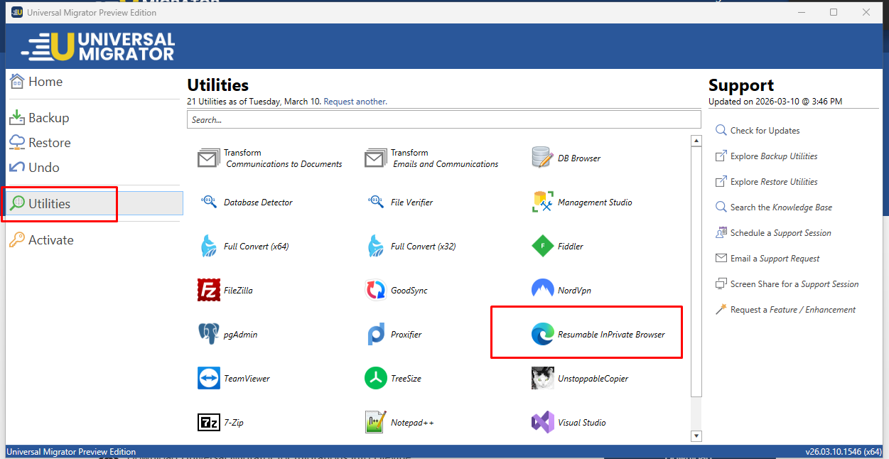 To launch the Resumable In-Private Browser, open up Universal Migrator and go to Utilities > Resumable InPrivate Browser: