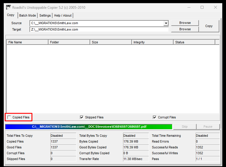 Once the transfer is complete, ensure that all files were successfully copied by unchecking Copied Files: