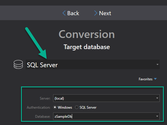 Select SQL Server from the option box near the top, indicated by the green arrow below.